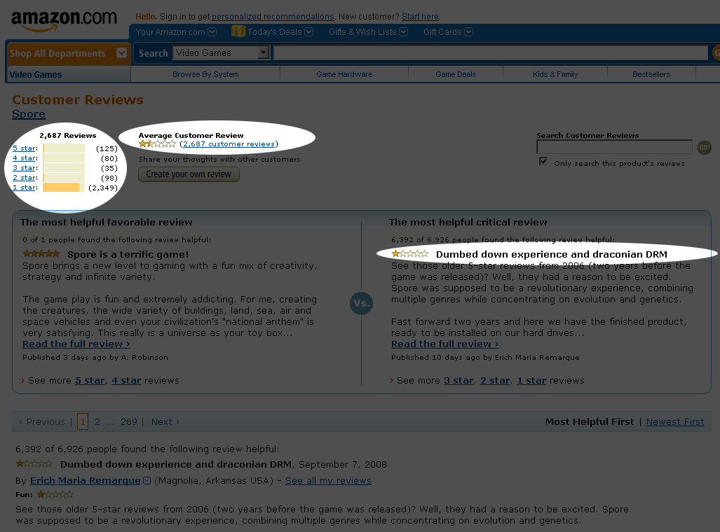 In the eyes of the customers this was unacceptable. Thousands of customers reviewed “Spore” with a single star on Amazon.com: