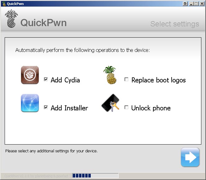 Select packages you can check them, in case the packages are not pre-chosen for including into your custom IPSW. Then click the blue arrow again.
